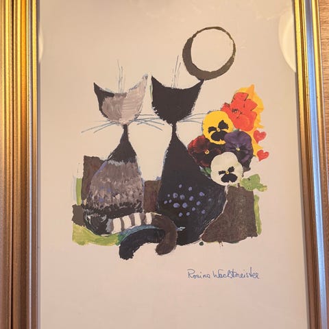 Rosina Wachtmeister kunst. Jeg vet ikke om trykk er riktig tittel. Har to stk bilder av hennes kjente kattemotiv. Mål 34x44 cm inkl ramme. Profesjonelt innrammet. Kjøpt hos kunsthandler i Oslo. Selges for kr 400 pr stk.