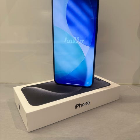 Selger en iphone 15 pro max i fargen svart titan.