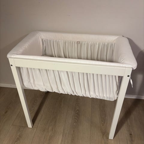 Vi hadde stor nytte av vuggen den første tiden i stua, slik at babyen hadde en trygg plass å ligge når toåringen var hjemme. Sengen er stødig, og passe høy til at toåringen kunne se, men ikke røre.