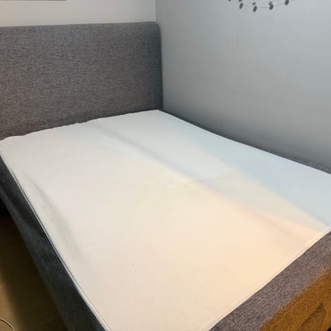 Skeidar rammemadrass med mørkt stofftrekk og ben i mørk farge. Må hentes uke 5
