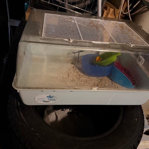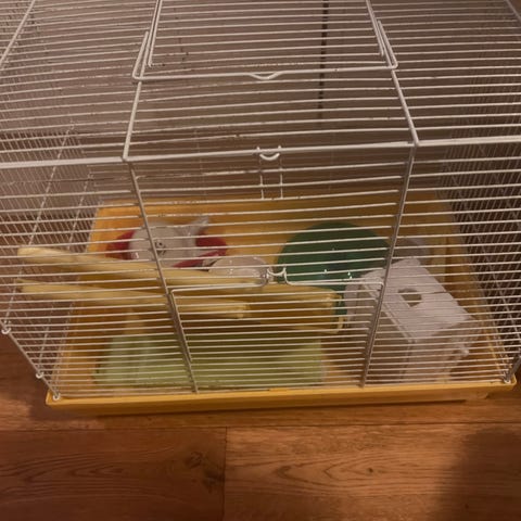 Hjemmelaget. Kjøpte det av noen på Finn. Det lekker litt flis fra forsiden av buret. Sikkert lett å fikse for noen som er litt handy.
