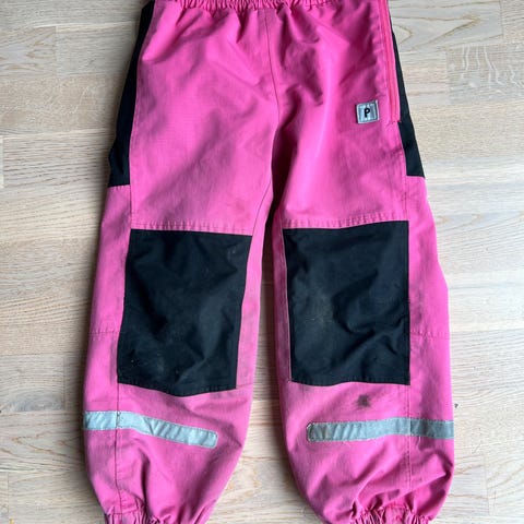 Polarn O. Pyret vinterbukse i størrelse 128 for jente. Buksen er rosa og laget i polyester. Den har forsterkede partier på knærne for økt slitestyrke. Passer til bruk i kaldt vær. Noe slitasje på knær og baken, se bilder - dette kan enkelt fikses