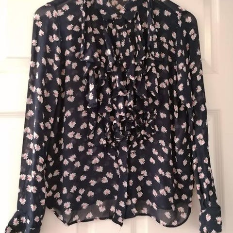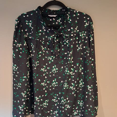 Ganni bluse i størrelse 36, svart farge med mønster. Laget av viskose materiale. Designet for kvinner.