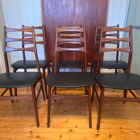 6 retro stoler i teak med originalt stoff