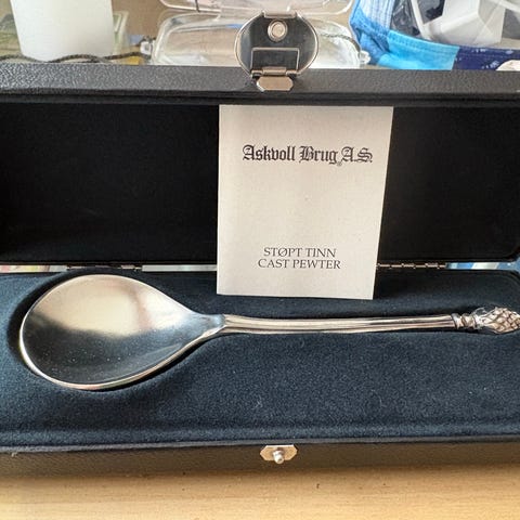 Perfekt til espresso eller mocca. Skjeen er som ny – ikke synlig brukt, kun naturlig oksidasjon på sølvoverflaten.