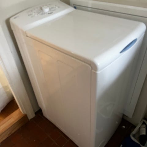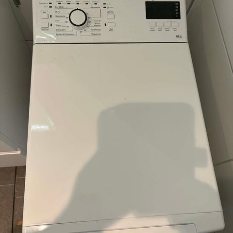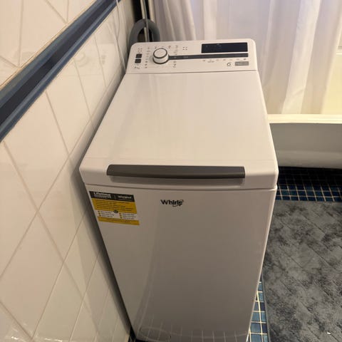 Whirlpool toppmatet vaskemaskin med flere vaskemodus og kontrollpanel på toppen. Hvit farge og standard design for enkel bruk og plassering.