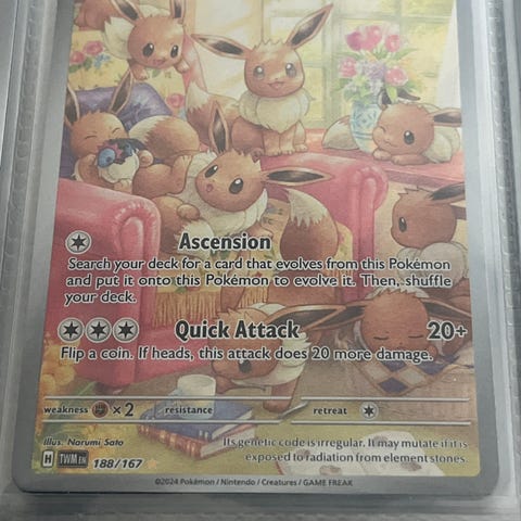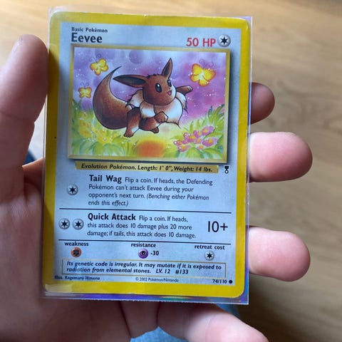 Pokémon Eevee Pokémon-kort med holografisk design. Kortet viser Eevee med fargerike detaljer og en bakside med Poké Ball-illustrasjon. Kortet er en del av Pokémon-kortsamlingen.