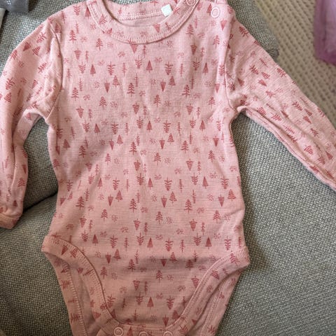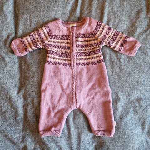 Joha Ull sparkedrakt i størrelse 62 cm for barn. Laget av 100 % ull, med mønster i lilla og mørkere lilla toner. Sparkedrakten har knappelukking foran. Lite slitt område bak på rumpa, se bilde.