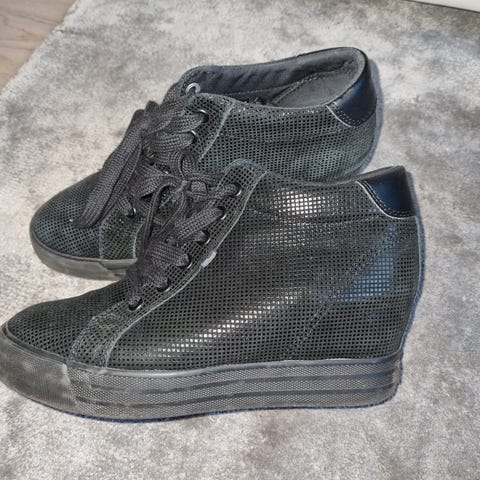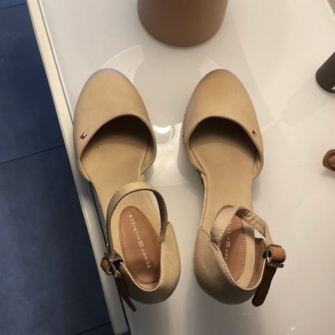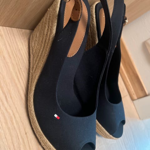 Tommy Hilfiger Gigi Bootie hæler i størrelse 40. Skoene er svarte og har detaljer med spenner. Materialet er ikke spesifisert, men skoene har en glatt overflate. Egnet for bruk som formell eller uformell fottøy. Hælhøyde 10 cm.