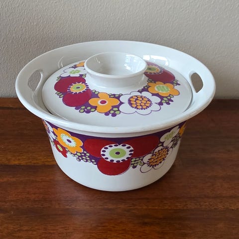 Fin vintage melkemugge fra Rørstrand, Sweden i serien Japonica. Design Jackie Lynd. Høyde 9 cm og lengde fra nebb til hank ca 15,5 cm. En liten ujevnhet fra produksjon i bunnen inni.