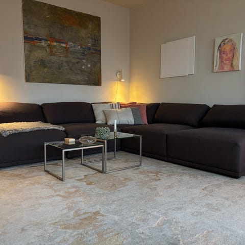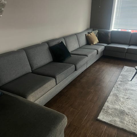 Sofaen deles i 3 deler for transport, hver del bæres enkelt av 2 personer.