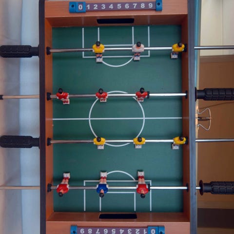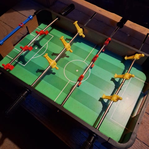 Fotballspill bordspill med håndtak, spillere i gult og rødt, og grønn spilleflate. Passer for innendørs bruk og kan brukes til underholdning og trening av ferdigheter i bordfotball.Må hentes på Lade