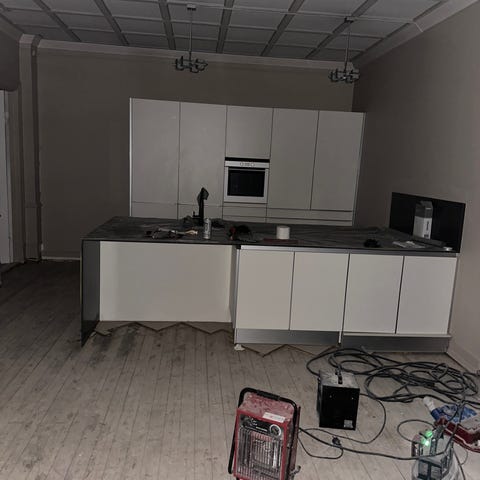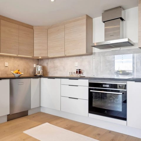 Inkluderer integrerte Simens hvitevarer som stekeovn, koketopp og kombiskap kjøl/frys. I tillegg til Villavent ventilator fra Røroshetta. Benkeplatene er av svært holdbart materiale og uten synlig bruksmerker. Kjøkkenet fremstår som et fortsatt moderne og funksjonell utforming med få, små bruksmerker.