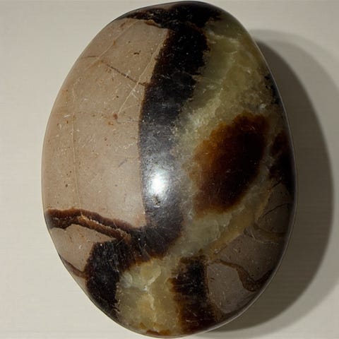 Grønn månestein som veier 532 gr og er 15,5 cm på høyden og ca. 8 cm på bredden.