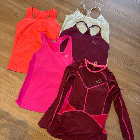 Bumpro treningsklær for dame i størrelse S. Sett bestående av rød topp med glidelås, svart sports-bh og svart treningsbuks.