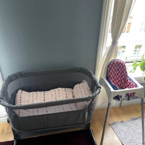 Troll babyseng bedside crib i hvit. Den ene langsiden kan tas ned. Høyden kan justeres. Det følger med stropper slik at den kan festes inntil en seng.