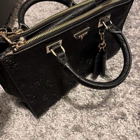Lite brukt veske fra guess selges. Mulig å løsne fremre del av vesken, slik at den ikke blir «dobbel». Se bilder for små bruksmerker. Har også et kjede til som kan henges på fremsiden, men som er avtagbart. Kjøpt i København. Dustbag medfølger. Kan sendes!