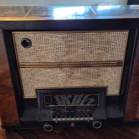 Instrumentet har en klassisk design med trebenet stativ og kontrollknapper på frontpanelet. Laget i Italia på 1950-tallet.