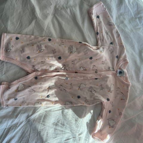 Petit Bateau babyheldrakt i rosa, størrelse 67 (merket er litt lite i størrelsen, så mer som en str. 62). Laget i mykt materiale egnet for spedbarn. Pent brukt.