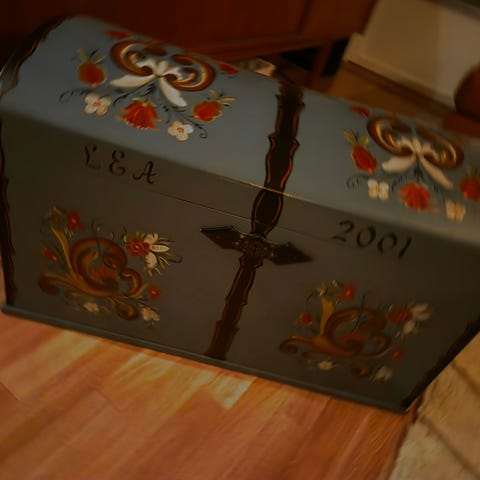 Fin rosemalt kiste fra 1974. Lite brukt, men litt malings-slete.