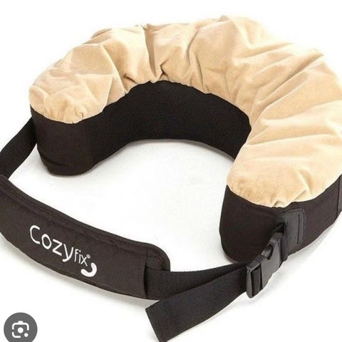 Cozyfix nakkepute i beige og svart farge. Puten har en myk, fløyelsaktig overflate på den ene siden og en mer robust tekstur på baksiden. Justerbart belte for feste.