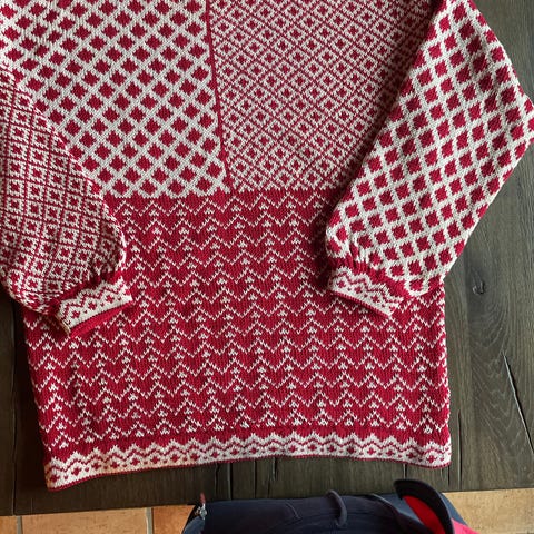 Mål: overvidde 108cm, ermlengde 53cm og lengde 60cm.