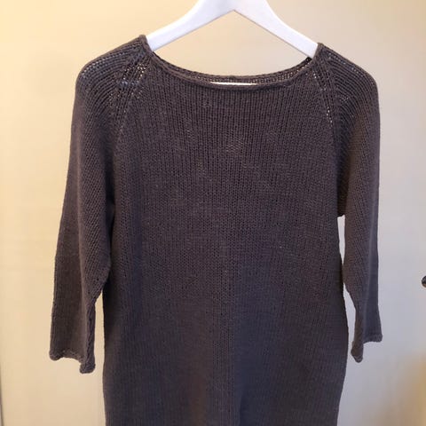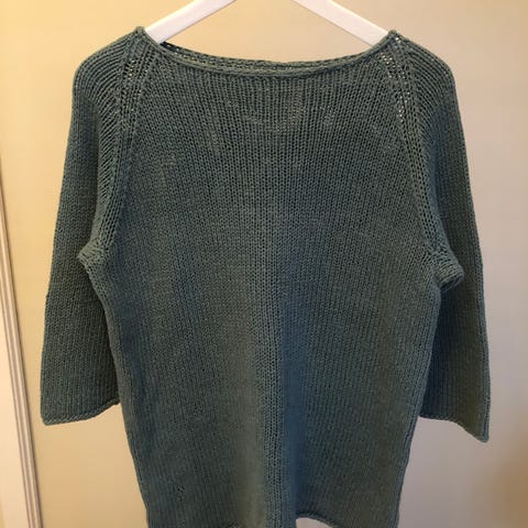 Håndstrikket damegenser i 100% bomull, størrelse L. Genseren har et enkelt design med rund hals, raglanerme og 3/4 ermlengde. Genseren er i en nydelig blåfarge.
