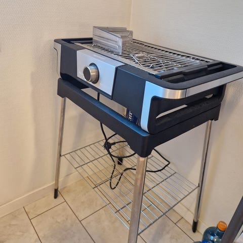 Denne elektrisk grill kan brukes både som frittstående grill med stativ eller som bordgrill.
