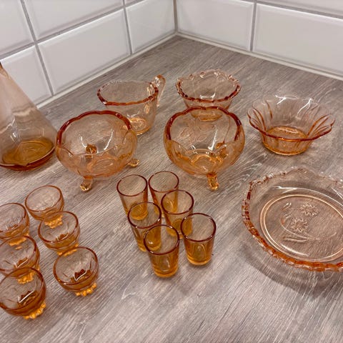Nydelig vintage Arcoroc Rosaline Rosa salat bolle og fire stk. høye elegante likør/snapsglass.