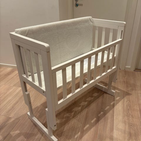 Troll Babyseng Bedside crib. Hvit bedside crib designet for å plasseres ved siden av foreldreseng. Laget i tre med spiler på alle sider for sikkerhet og ventilasjon.