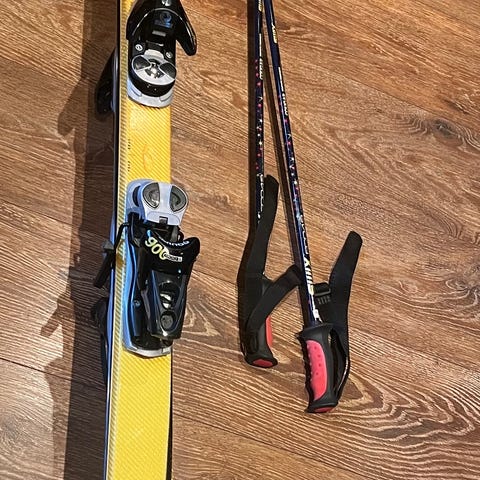 Selger et komplett alpintsett bestående av carvingski/slalomski, bindinger, staver og alpinstøvler – klart til bruk.