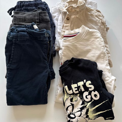 Klespakke gutt str 5/6 år. Pent brukt av ett barn, noe brukt av 2 barn. Hull på kne på dongeribukse og Janus ullbukse, se bilde. En del fra POMPdeLUX, ellers fra bla. Kappahl, Levis, Mads Nørgaard, nameit, Janus, Rose lille, Hummel, Cubus m.m.