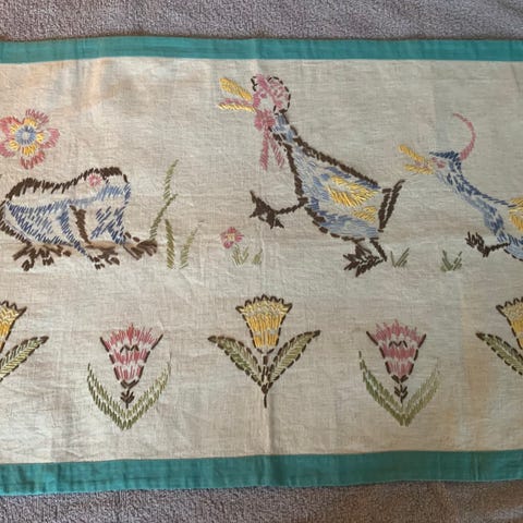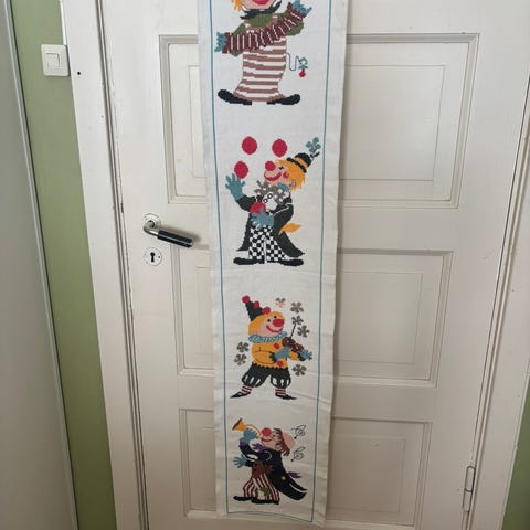 Søte håndbroderte bilder. 17 cm i diameter. Selges samlet for 80 kroner. Fine til barnerommet!