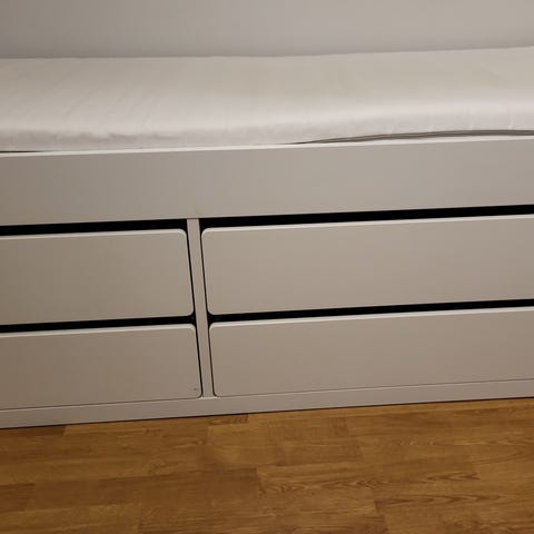 Pent brukt Ikea Släkt til salgs. Sengen har 2 skuffer for oppbevaring. Trekk til madrasser er vaskbart. Ingen synlige merker.