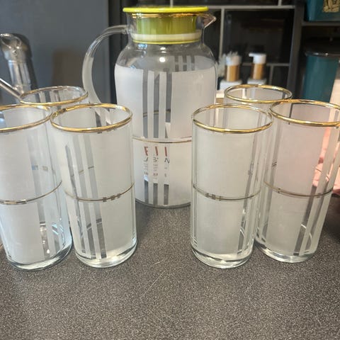 6 fargerike kopper på stativ selges da de ikke brukes. Selges samlet. Passer utmerket på en arbeidsplass eller på et trangt kjøkken.