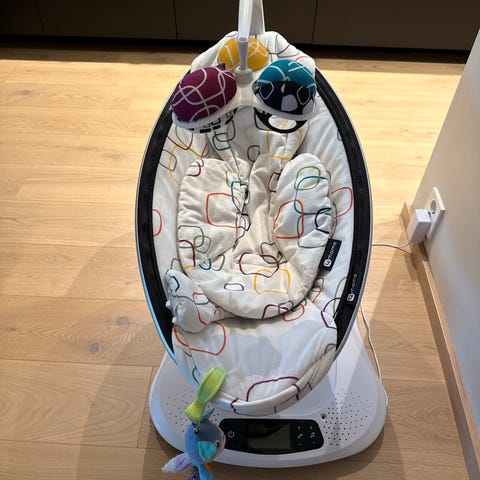 4moms elektrisk vippestol med nyfødt innlegg selges. Er kjøpt brukt av oss, noe søl på stroppene som ikke går bort men har ingen betydning for bruken. Flere hastigheter og ulike lyder som kan spille av.