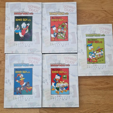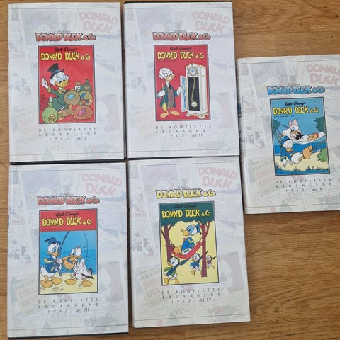 Bøkene er fra ca 1980. De inneholder historier tilbake fra Donald-start på midten av trettitallet og frem til utgivelse av disse bøkene. Mener jeg å ha lest i en bok. Fire av dem har litt slitasje-skader oppe på ryggen. En litt mer enn de andre. Jeg håper på en kjøper fra området, da jeg ikke har så lyst til å sende. Men ved interesse gjør jeg . Jeg selger for kr 150 pr stykk, men helst alle under ett for kr 900. Og da "Fiks ferdig" Kjøper fra området blir prioritert.