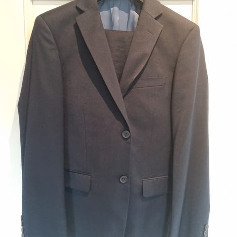 Dressmann Blazer og bukse i størrelse 48 for herre, laget av bomull i grå farge. Jakken har klassisk design med to knapper og lommer foran.