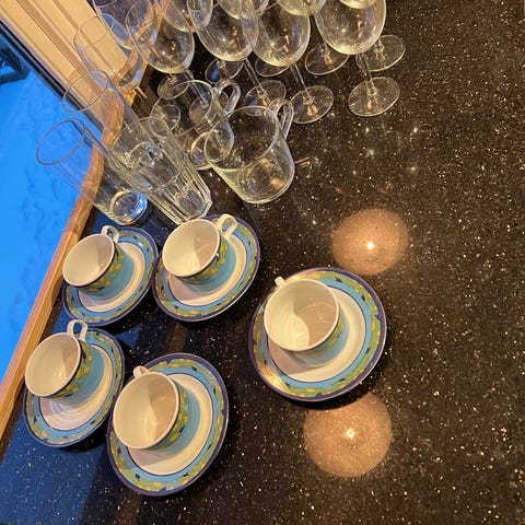 Partitur-servise til Porsgrunn Porselen sett med kopper, skåler og tallerkener. Sett inneholder fire kaffekopper med hank og tilhørende skåler og tallerkener. Fargen er hovedsakelig hvit med dekorative detaljer. Koppene er grå utvendig og hvite inni. Ble i sin tid spesialbestilt til Jotun som julegave. Tilnærmet ubrukt😊