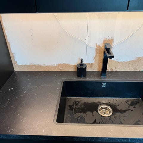 Grohe kjøkkenvask i sort farge med tilhørende armatur.