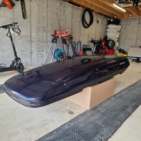 Skigyard 860 takboks i svart farge. Takboksen er designet for montering på bilens tak og gir ekstra lagringsplass for bagasje og utstyr. Den har et robust ytre skall og en innvendig ramme med stropper for sikring av innholdet.