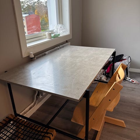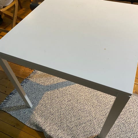 Må hentes. Kjøkkenbord selges. Kan gjøres lenger ved å dra ut plater på hver side av bordet. Solid bord med bruksmerker, men som kan slipes og males :)