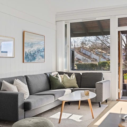 Selger Cleveland sofa i lyst stoff fra Skeidar.