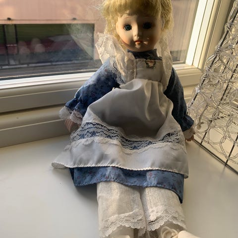 Inkluderer en vintage barnevogn i metall med tekstildetaljer. Dukker har forskjellige hårfarger og ansiktsuttrykk, og klærne består av stoffmaterialer. Passer som samlerobjekt eller dekorasjon.