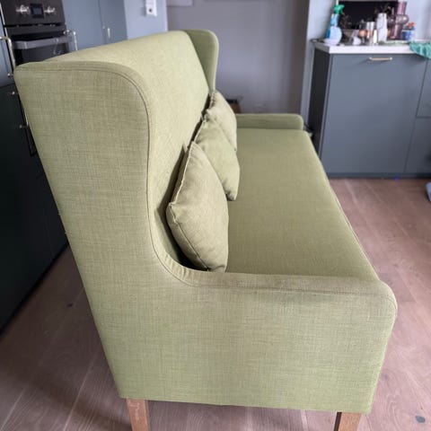 Pen spisestue sofa i off-white med bruksmerke på det ene armlenet