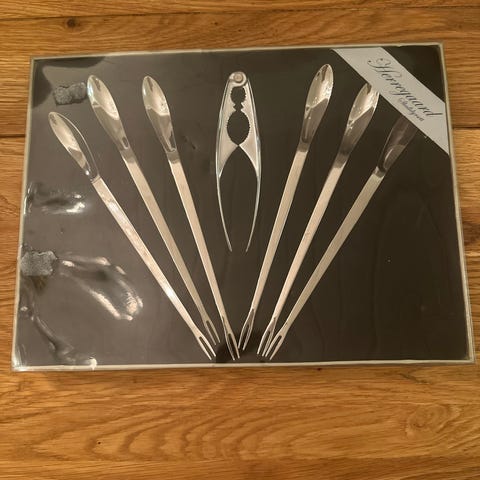 Sett med 6 gafler og en kloknekker. Helt nytt i eske.