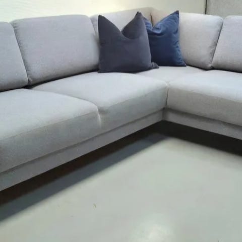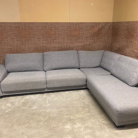Veldig fin vinkelsofa med avslutning på venstre side, sett forfra.