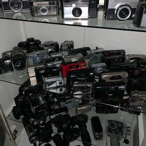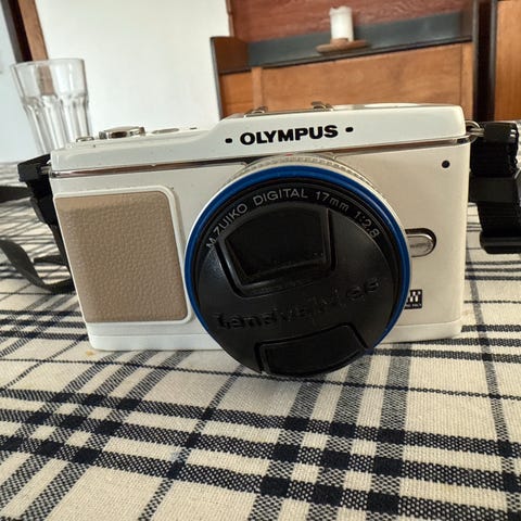 Olympus og Chinon kamera med forskjellige linser og diverse utstyr.