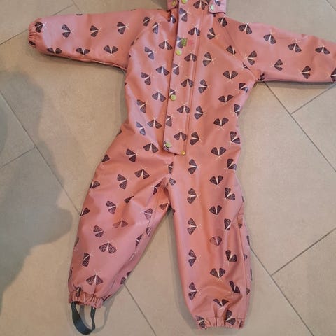 Pent brukt regnsett. Noe slitasje øverst (se bildet), ellers ikke noen hull. Mangler forstrikk.