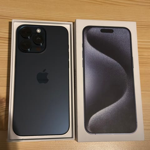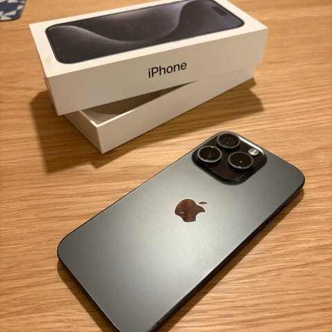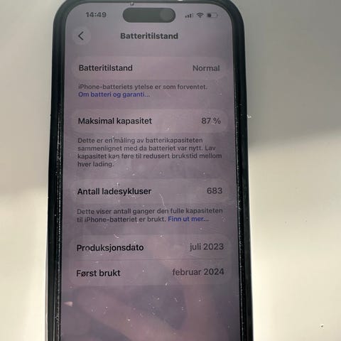 Apple iPhone 15 Pro mobiltelefon med 128 GB lagringskapasitet i svart farge. Telefonen har normal batteritilstand med maksimal kapasitet på 100 %. Først brukt i oktober 2023, med forventet produksjonsdato i juli 2025. Telefonen har 36 ladesykluser registrert. 6800-7500 pris